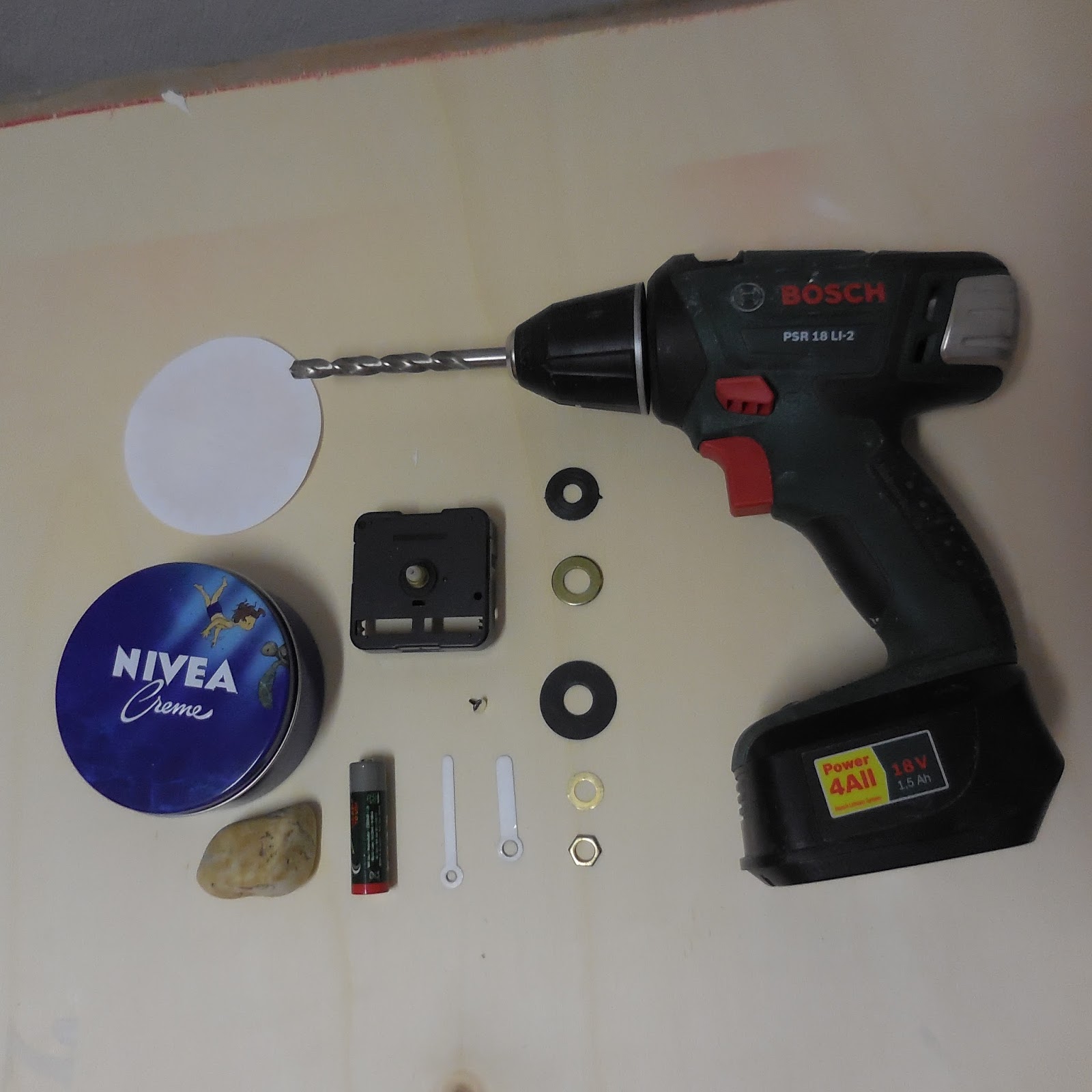 Schnappte sich das Uhrwerk der alten Uhr, einen Akkuschrauber, eine neue sauber ausgewaschene Cremedose, ein rundes Blatt mit dem gleichen Durchmesser, eine Batterie, oder Akku und einen Stein.